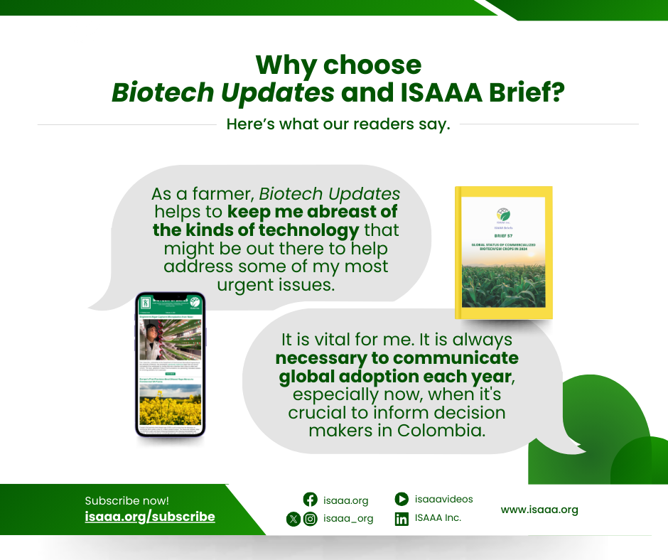 ISAAA Inc. feeds the world with knowledge of biotechnology by supporting transformative technologies, fostering impactful partnerships, and facilitating the development of science-based policies toward food-secure communities.