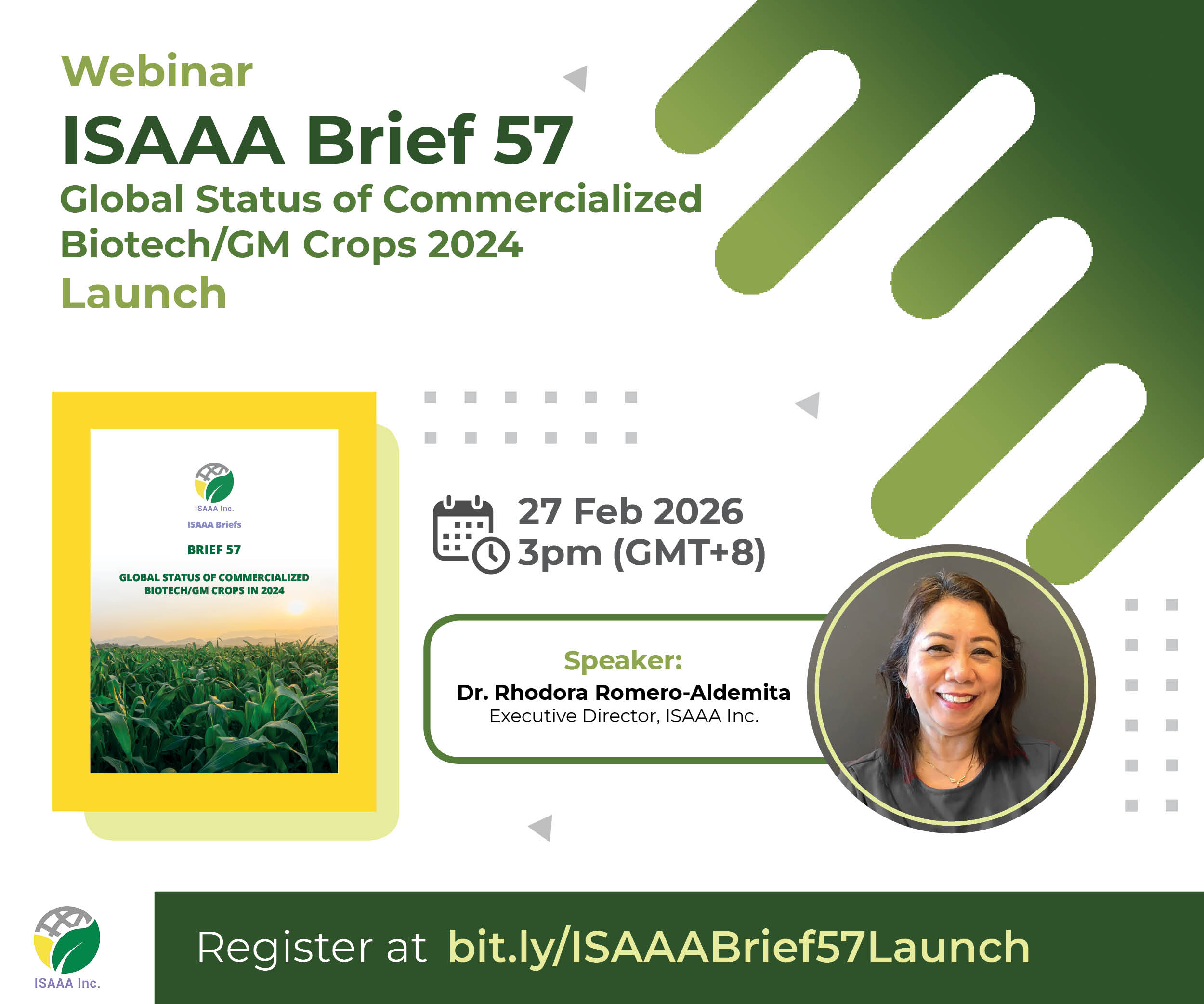 ISAAA invites all interested to join the Brief 57 launch webinar to be held on February 27, 3:00 - 4:00 PM (GMT+8) via Zoom.