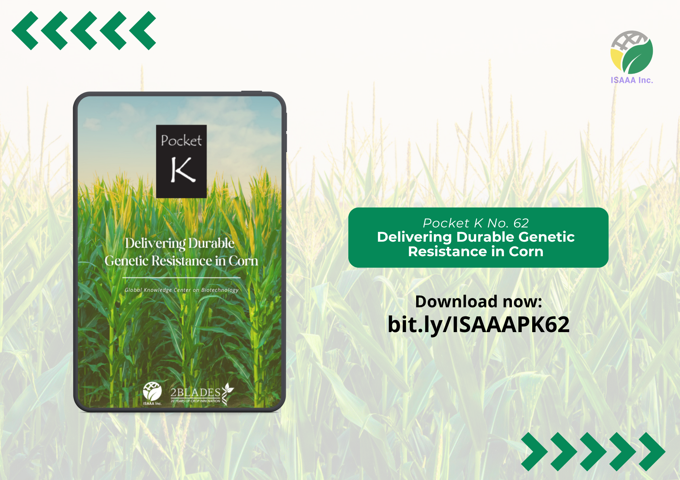 ISAAA, Inc., in collaboration with 2Blades, releases Pocket K No. 62 titled Delivering Durable Genetic Resistance in Corn. Pocket Ks are Pockets of Knowledge, peer-reviewed and packaged information on crop biotechnology products and related issues, which are available for download from the ISAAA website and optimized for printing or mobile use. This latest Pocket K discusses the development of durable genetic resistance in corn against fungal pathogens and mycotoxins using advanced plant immune system insights and gene discovery technologies.